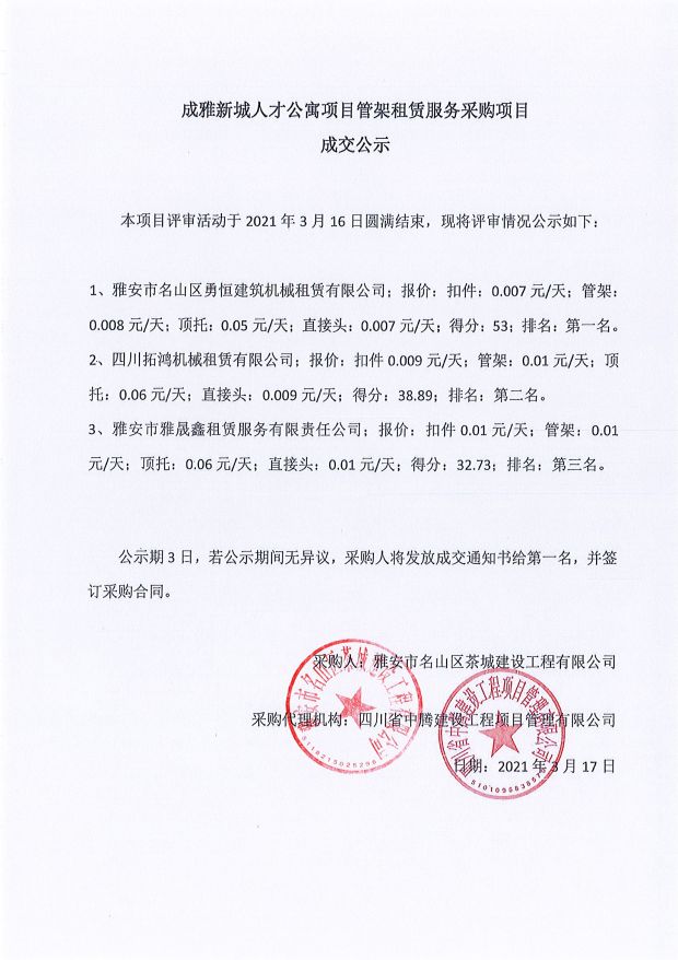 成雅新城人才公寓砂石、塔機租賃、土石方、鋼材、管架租賃、模板木方、水泥采購項目成交公示